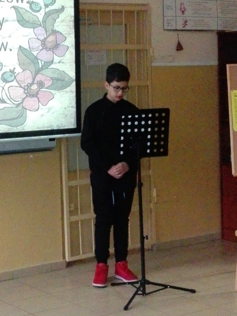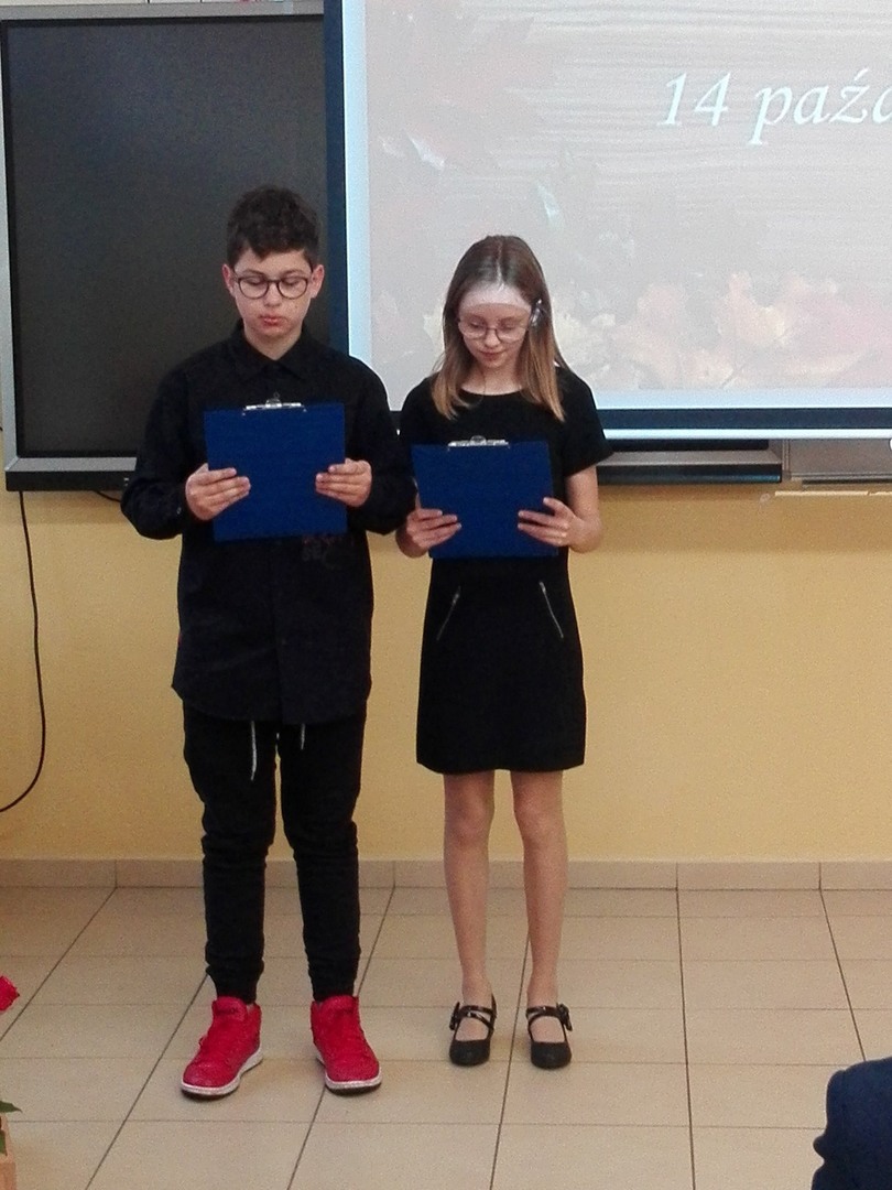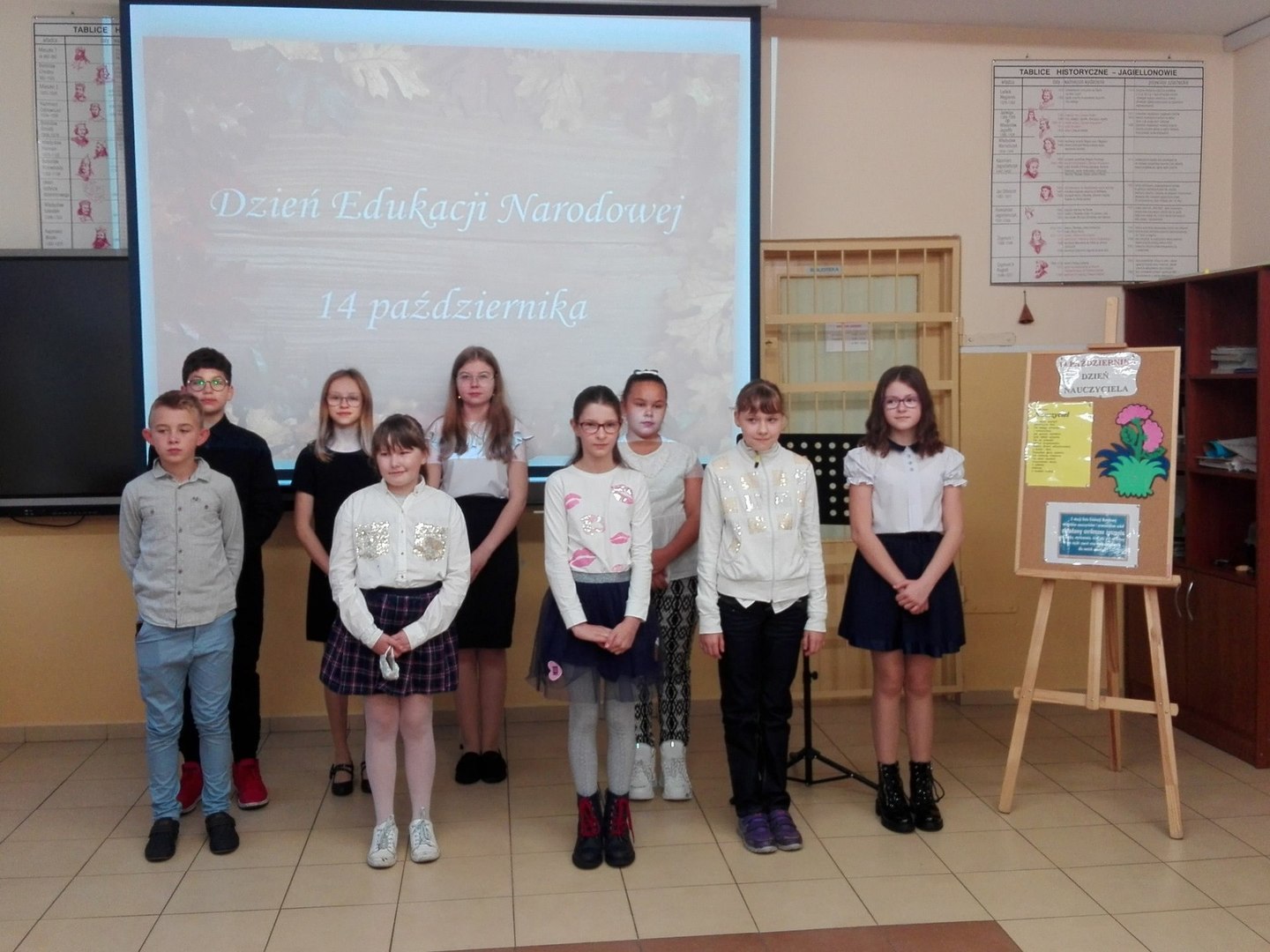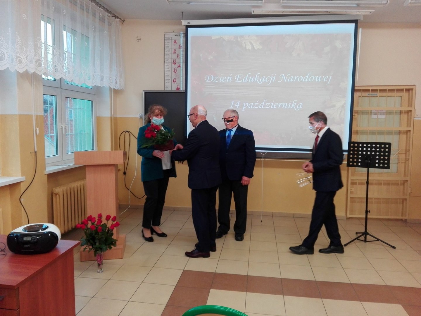 Kolejną częścią uroczystości był występ uczniów naszej szkoły. Wysłuchaliśmy kilku wierszy oraz piosenek. Obejrzeliśmy też prezentację przedstawiającą nauczycieli naszej szkoły przy pracy. Na koniec nauczycieli, pracownicy szkoły i goście zostali obdarowani laurkami i pięknymi różami.