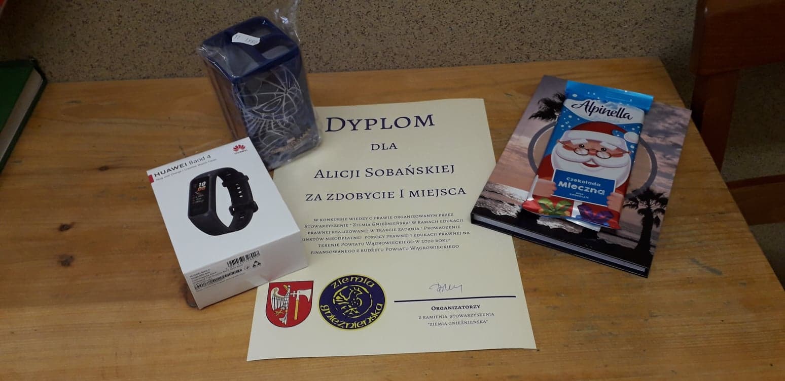 W Konkursie Wiedzy o Prawie organizowanym przez Stowarzyszenie ,,Ziemia Gnieźnieńska” w ramach edukacji prawnej realizowanej w trakcie zadania ,,Prowadzenie punktów nieodpłatnej pomocy prawnej i edukacji prawnej na terenie powiatu wągrowieckiego w 2020 roku” finansowanego z budżetu powiatu wągrowieckiego wzięło udział 35 uczniów z 9 szkół podstawowych i ponadpodstawowych z powiatu wągrowieckiego. Konkurs organizowany był po raz drugi. W tym roku jego formuła była on-line. Miło nam poinformować, że uczennica naszej szkoły Alicja Sobańska zajęła exekwo I miejsce, a Hania Frieske wyróżnienie.