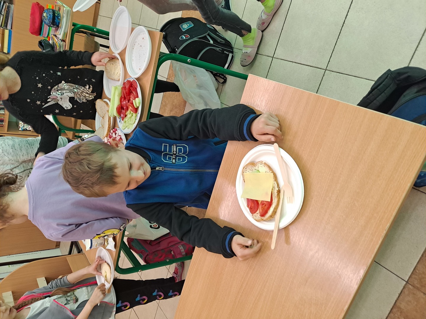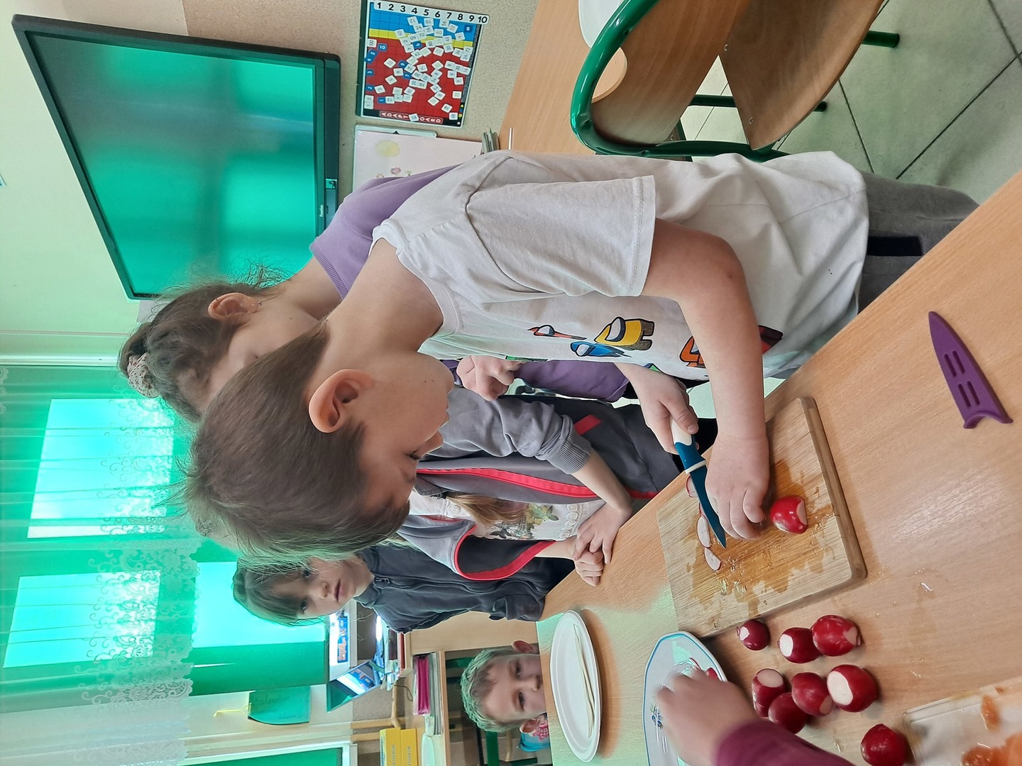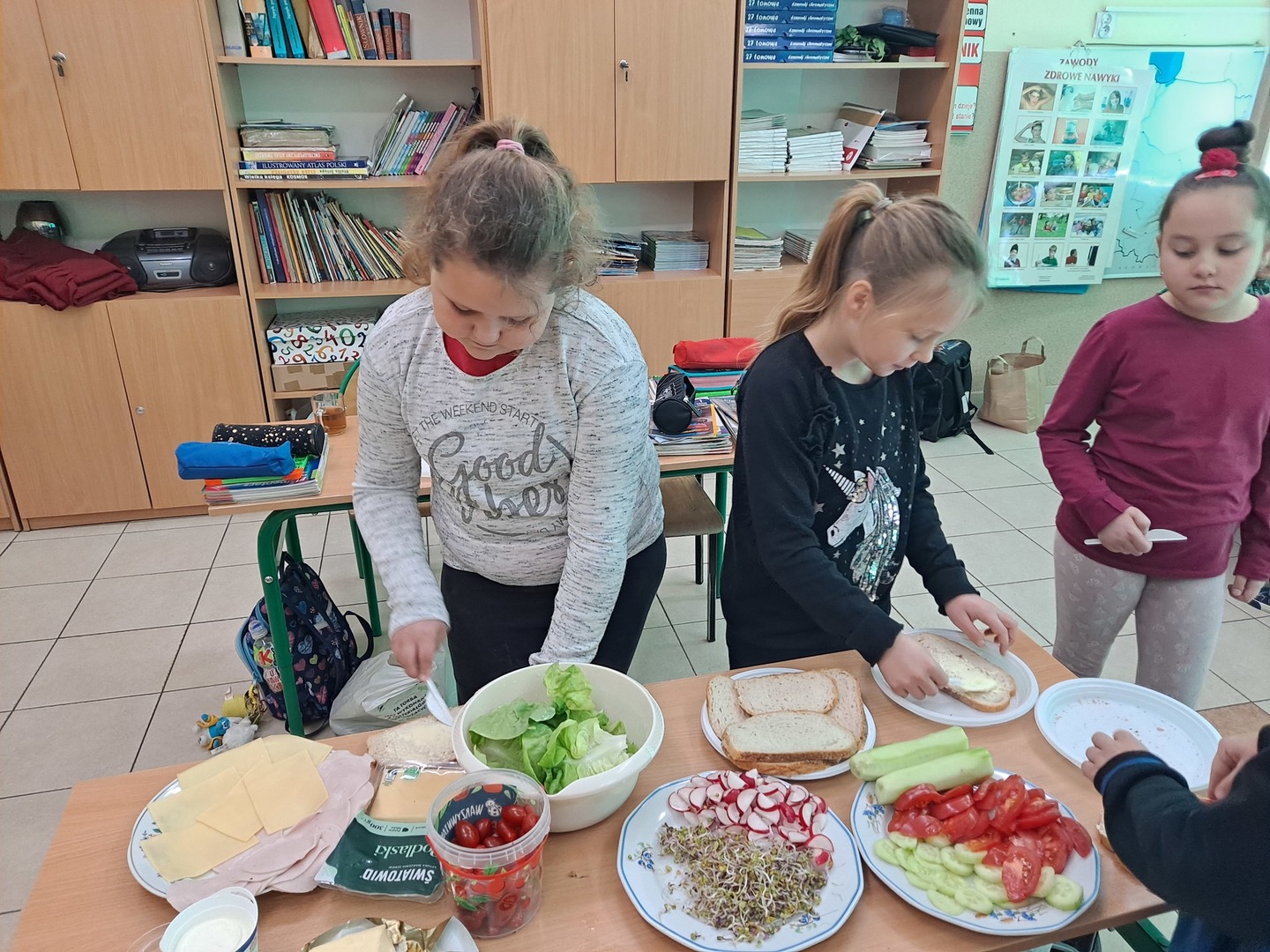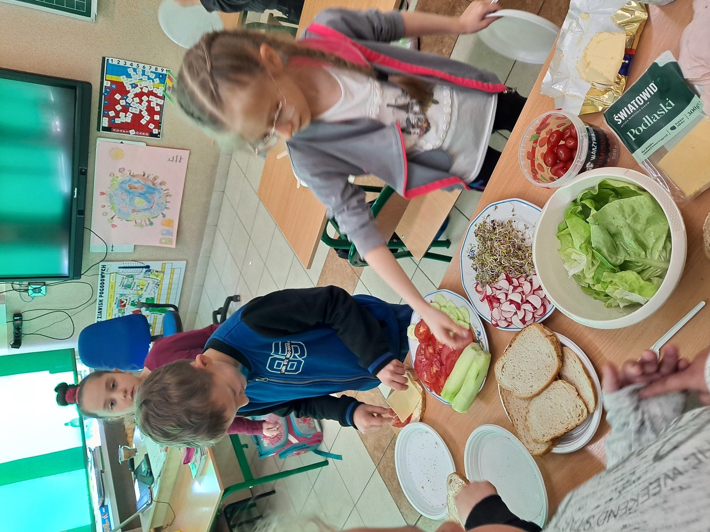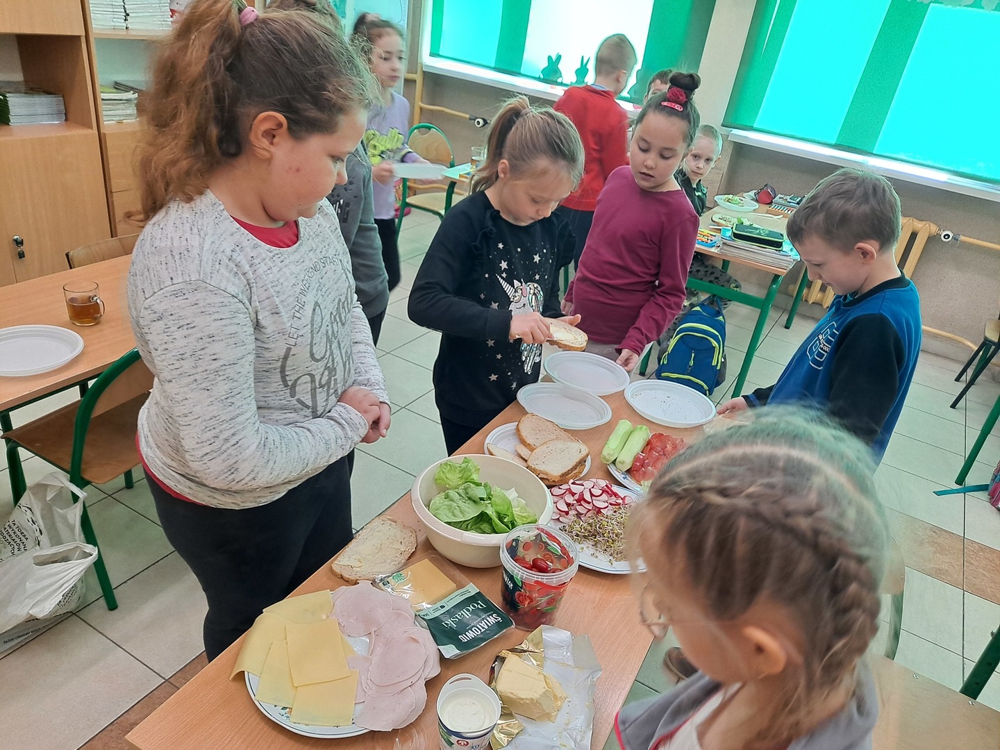 Klasa I naszej szkoły bierze udział w projekcie Dobrze Jemy ze Szkołą na Widelcu. Jest to projekt żywieniowo - kulinarny, który łączy ze sobą teorię i praktykę, dzięki czemu uczniowie na zajęciach mogą przekonać się jak łatwe i przyjemne może być przygotowywanie pysznych posiłków. W czwartek uczniowie samodzielnie wykonali wiosenne kanapki. Wszyscy uczniowie bardzo zaangażowali się w swoją pracę – samodzielnie pokroili warzywa, które później z ochotą nakładali na swoje kanapki.