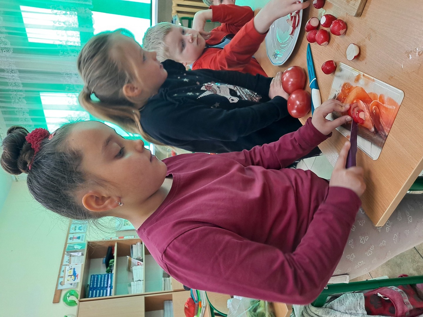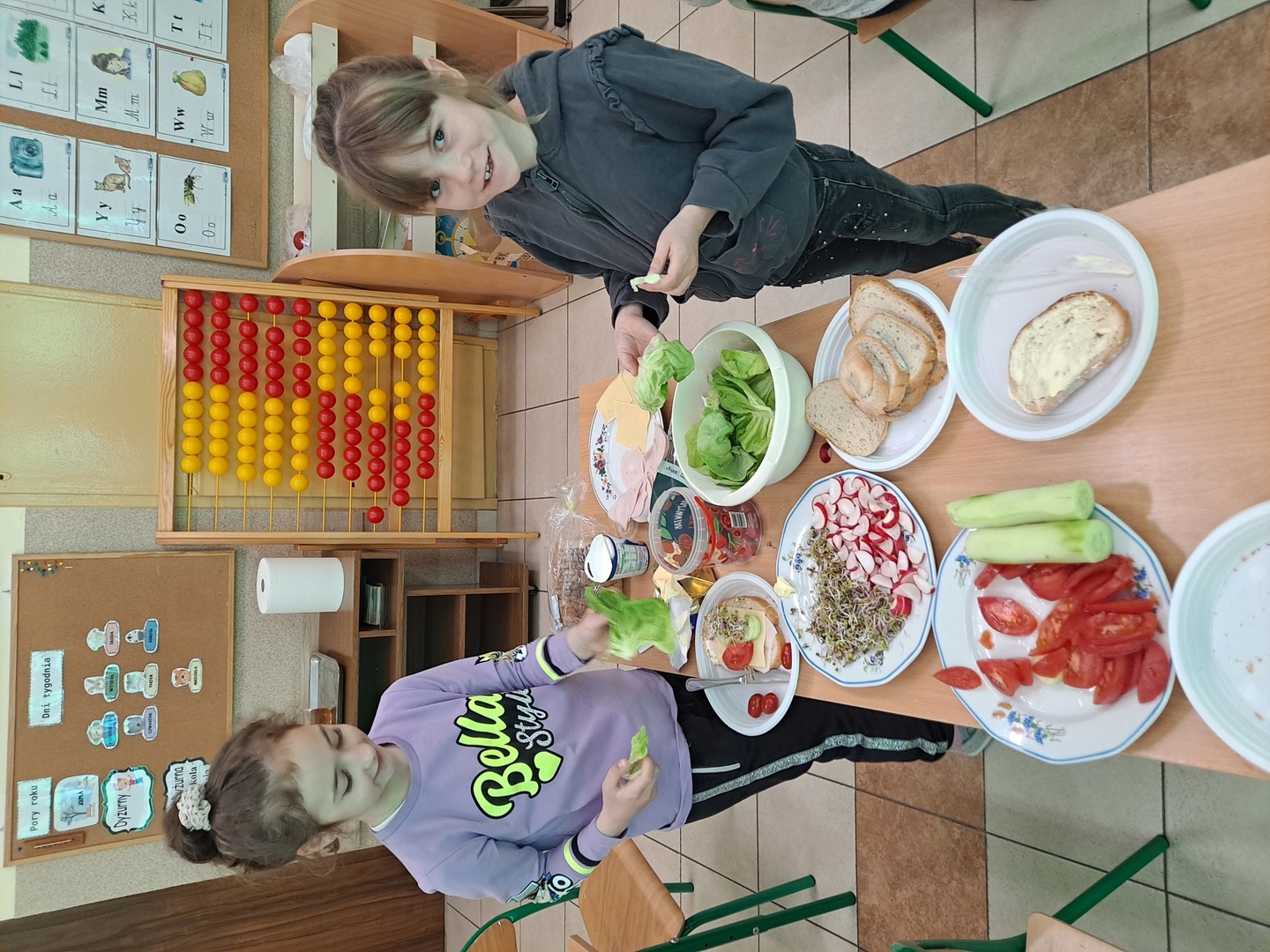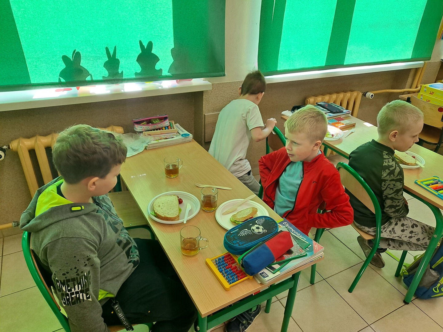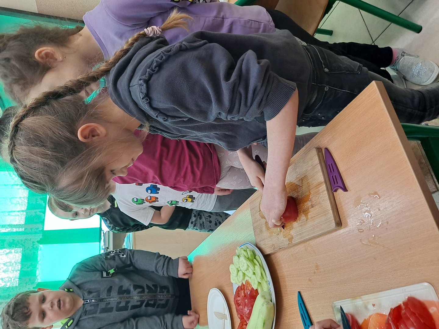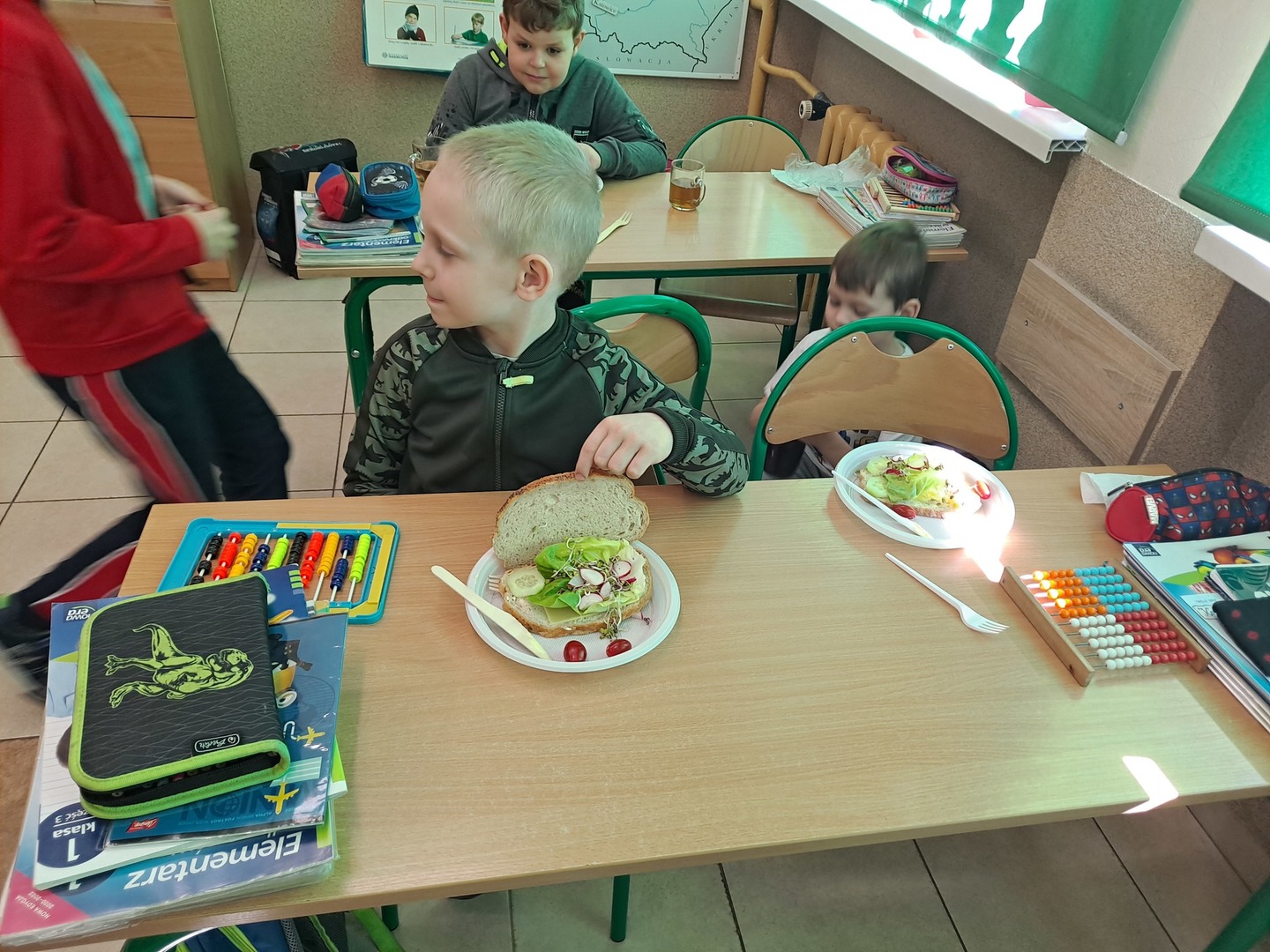 Klasa I naszej szkoły bierze udział w projekcie Dobrze Jemy ze Szkołą na Widelcu. Jest to projekt żywieniowo - kulinarny, który łączy ze sobą teorię i praktykę, dzięki czemu uczniowie na zajęciach mogą przekonać się jak łatwe i przyjemne może być przygotowywanie pysznych posiłków. W czwartek uczniowie samodzielnie wykonali wiosenne kanapki. Wszyscy uczniowie bardzo zaangażowali się w swoją pracę – samodzielnie pokroili warzywa, które później z ochotą nakładali na swoje kanapki.