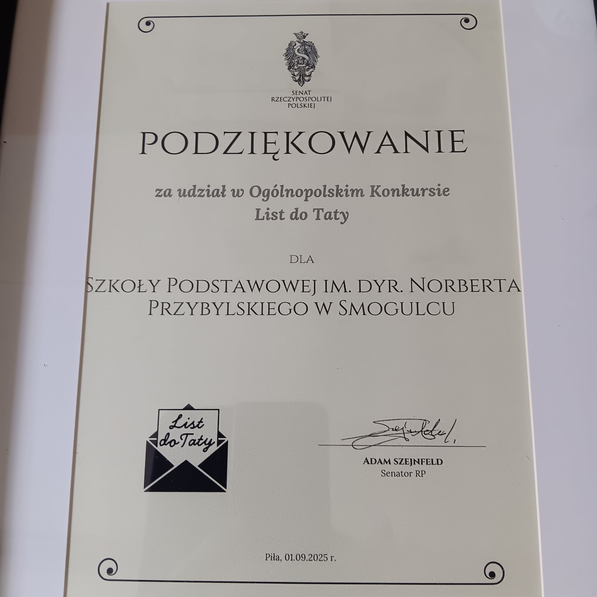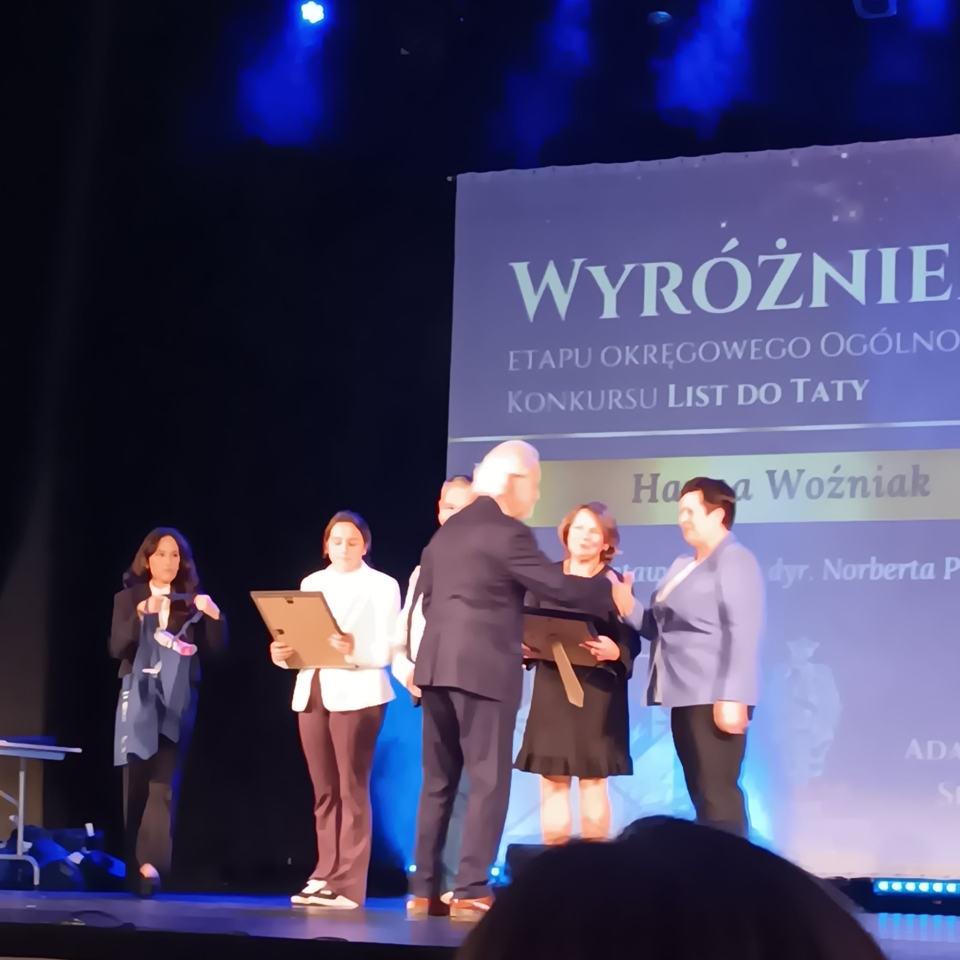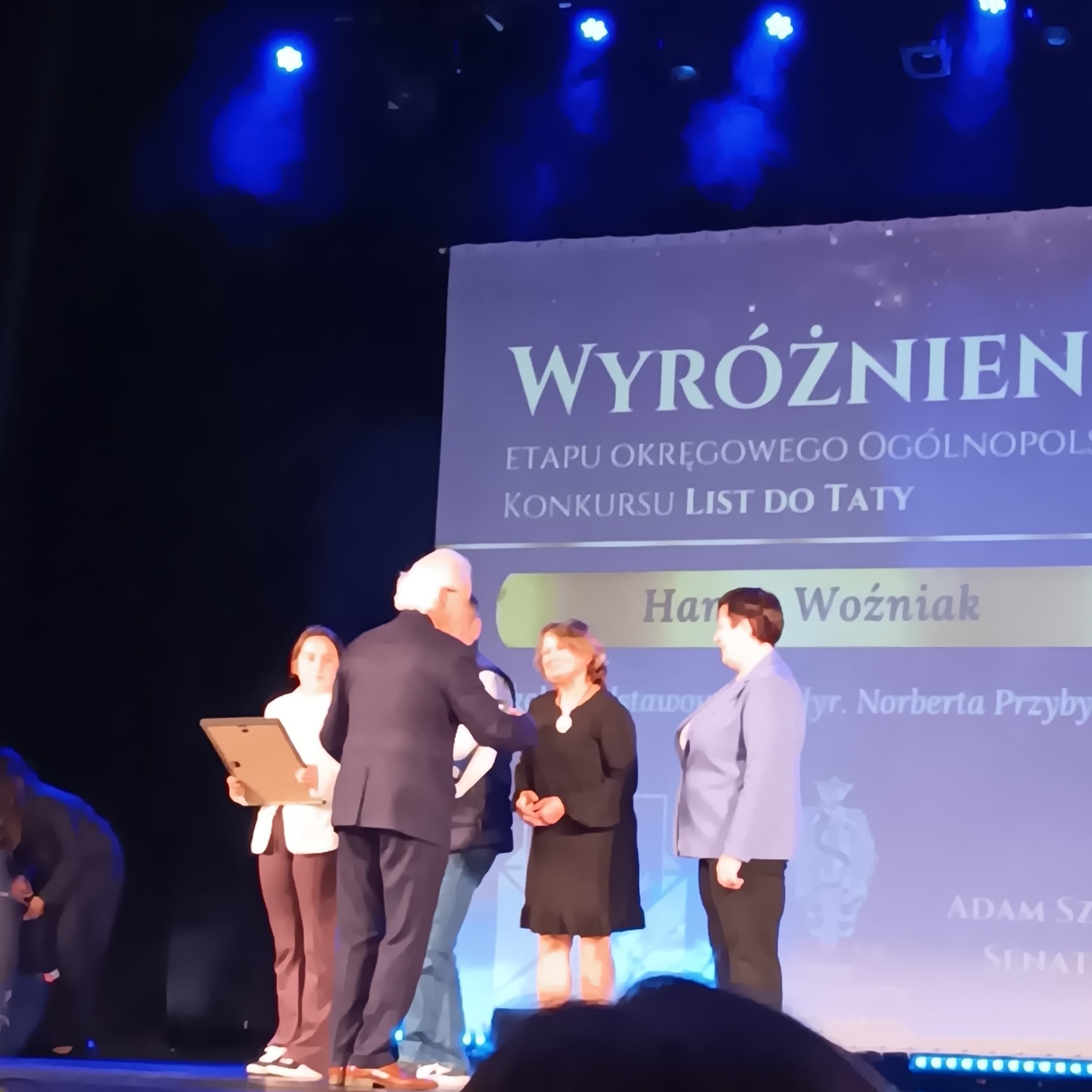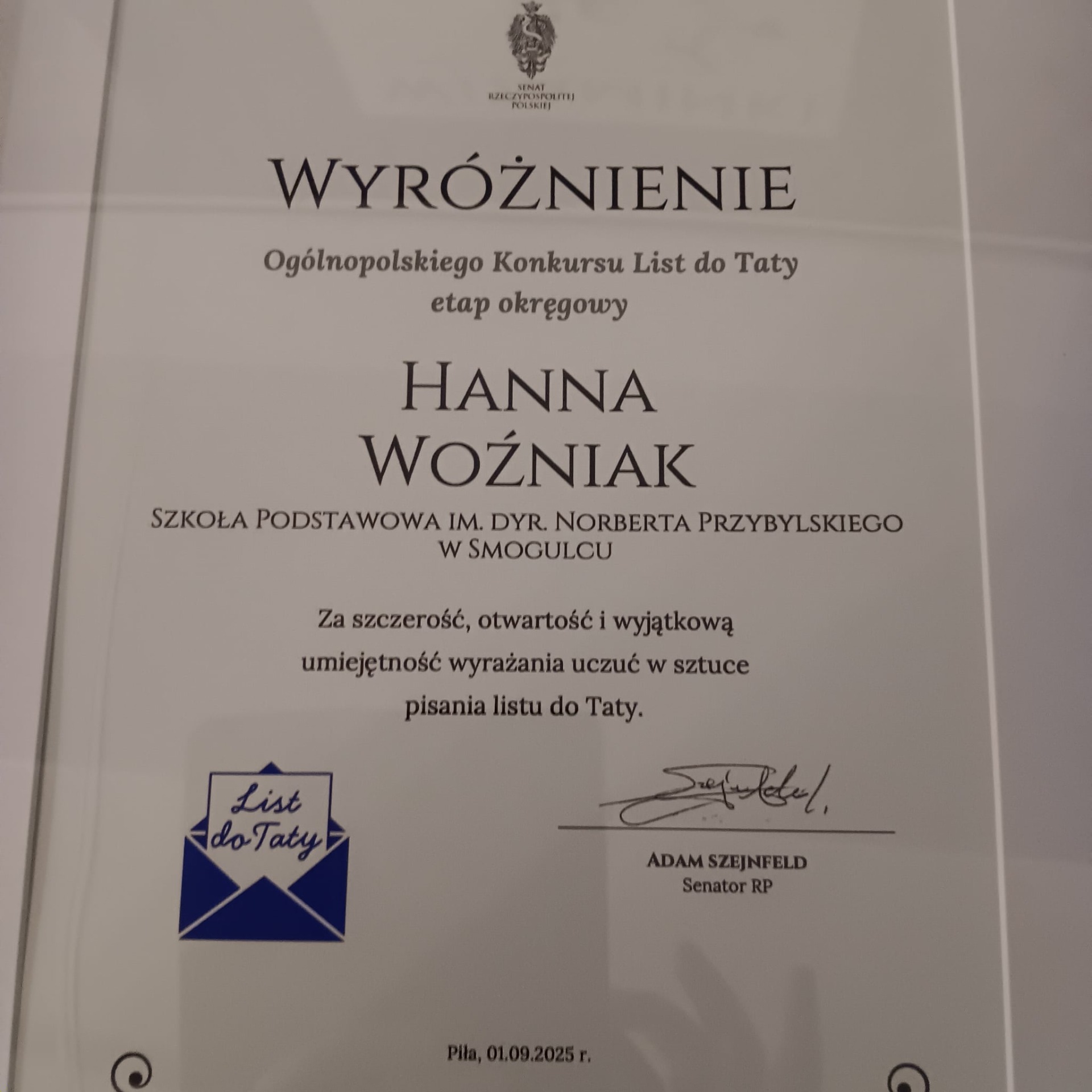 29 września uczennice naszej szkoły wzięły udział w Gali Finału Okręgowego Ogólnopolskiego Konkursu „List do taty”, który został zorganizowany przez Senacką Komisję Rodziny, Polityki Senioralnej i Społecznej. Emilia Deleżuch z klasy V, Katarzyna Owecka i Nikola Sobańska, obie z klasy VI, otrzymały za udział pamiątkowe dyplomy i drobne upominki. Hanna Woźniak z klasy VI została uhonorowana wyróżnieniem. Ona i jej tata, Pan Rafał Woźniak, dostali dyplomy, podziękowania i upominki. Została też doceniona praca Pani Dyrektor Krystyny Janowiak oraz opiekunki i szkolnego koordynatora konkursu pani Lucyny Socha. Gala przebiegła w bardzo uroczystej atmosferze. Serdeczne podziękowania dla wszystkich, którzy przyczynili się do osiągnięcia tego niecodziennego sukcesu.