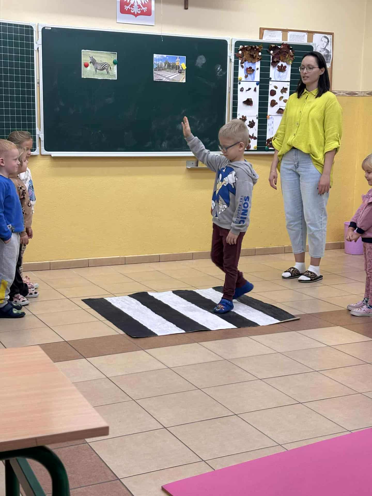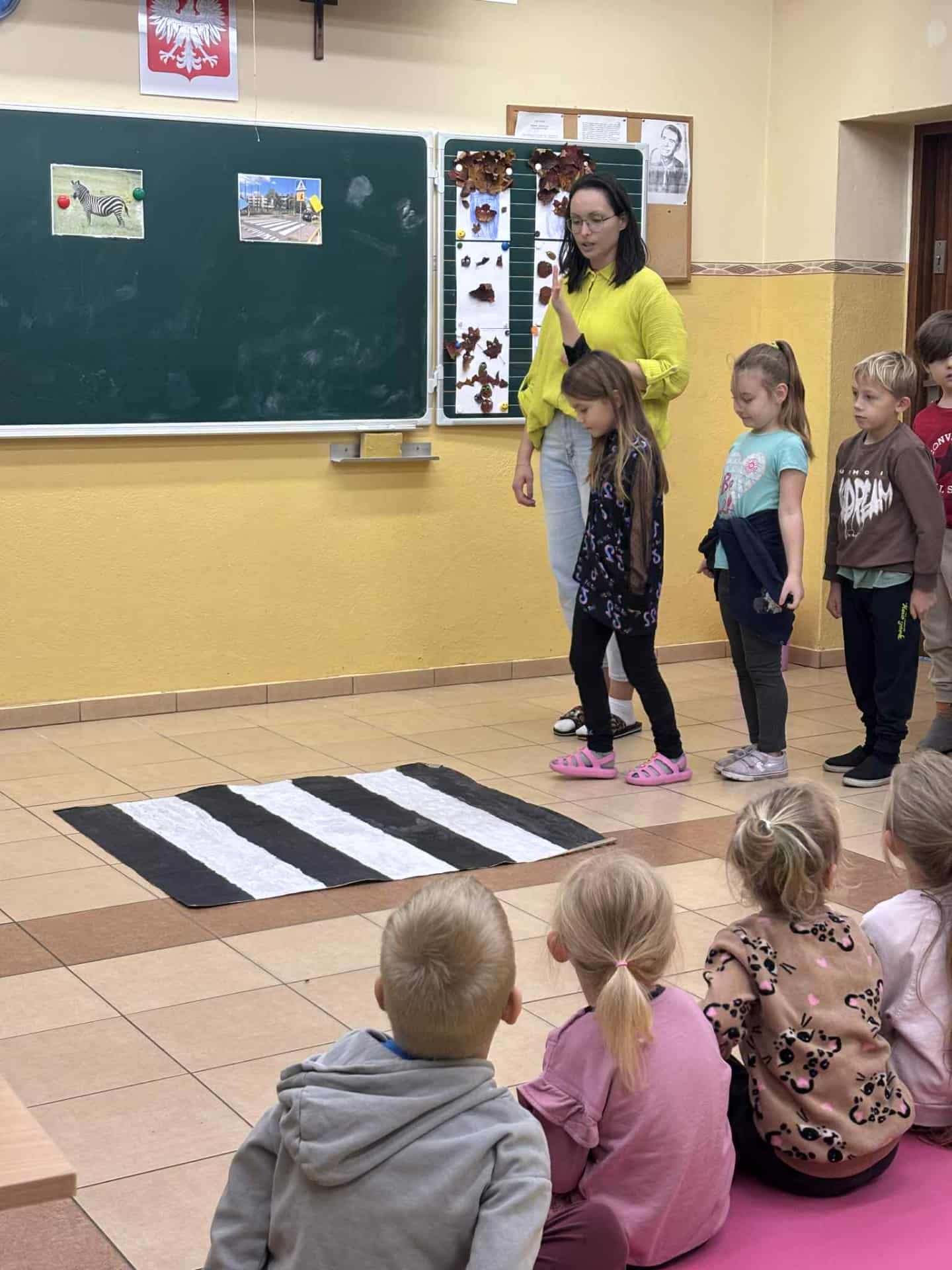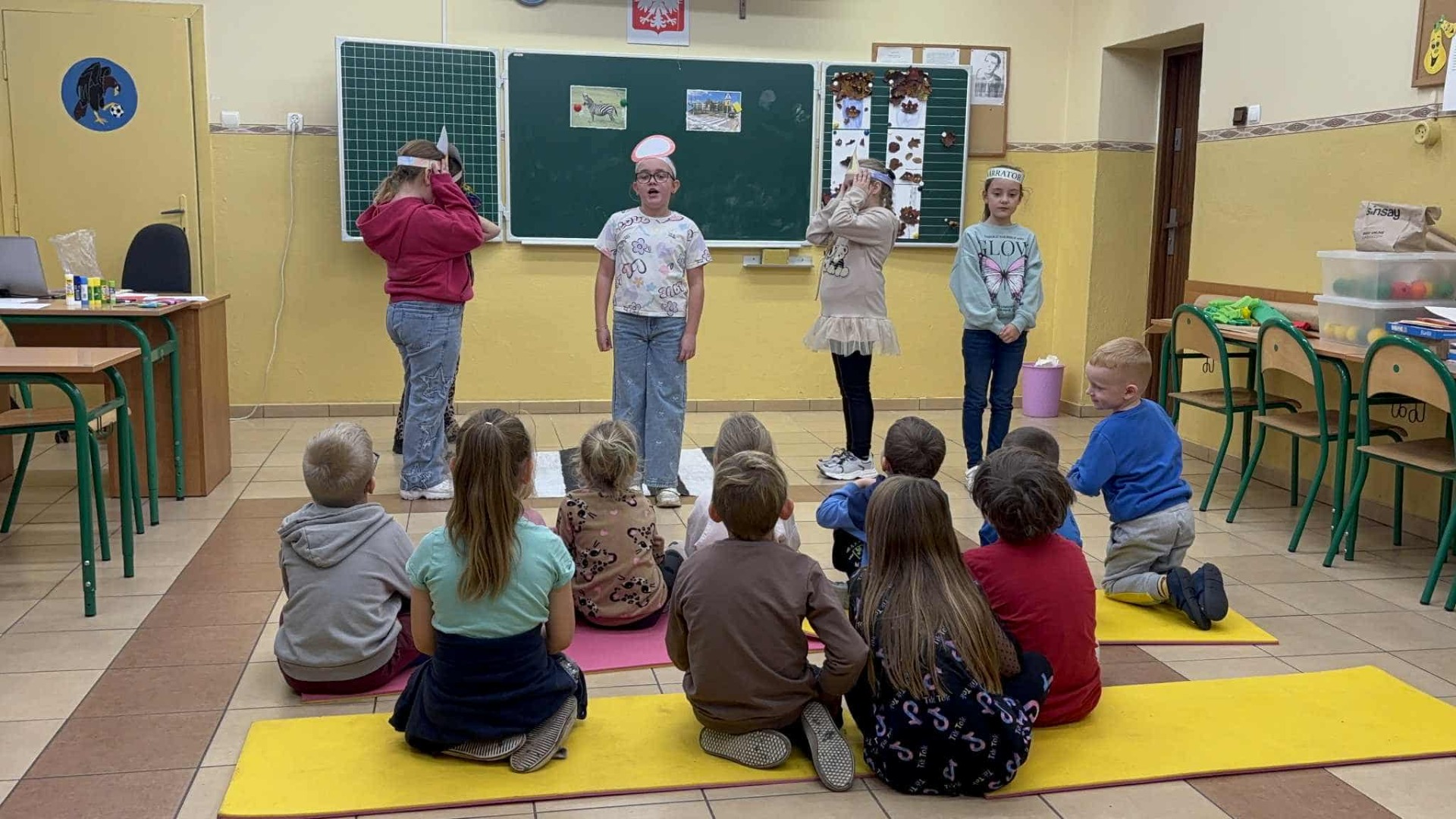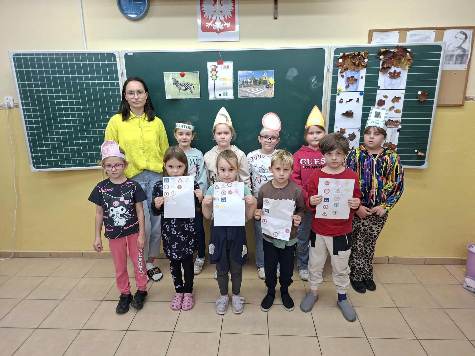 Dnia 24.10.25r. klasa III zaprosiła oddział przedszkolny i klasę I na lekcję o bezpieczeństwie na drodze. Dziewczynki z klasy trzeciej przygotowały krótką inscenizację związaną z ruchem drogowym oraz piosenkę "Bezpieczna droga". Własnoręcznie wykonały opaski do inscenizacji oraz stworzyły pasy, które pomogły wszystkim poćwiczyć prawidłowe przechodzenie przez jezdnię. Lekcja przebiegła nam w radosnej i tanecznej atmosferze.
