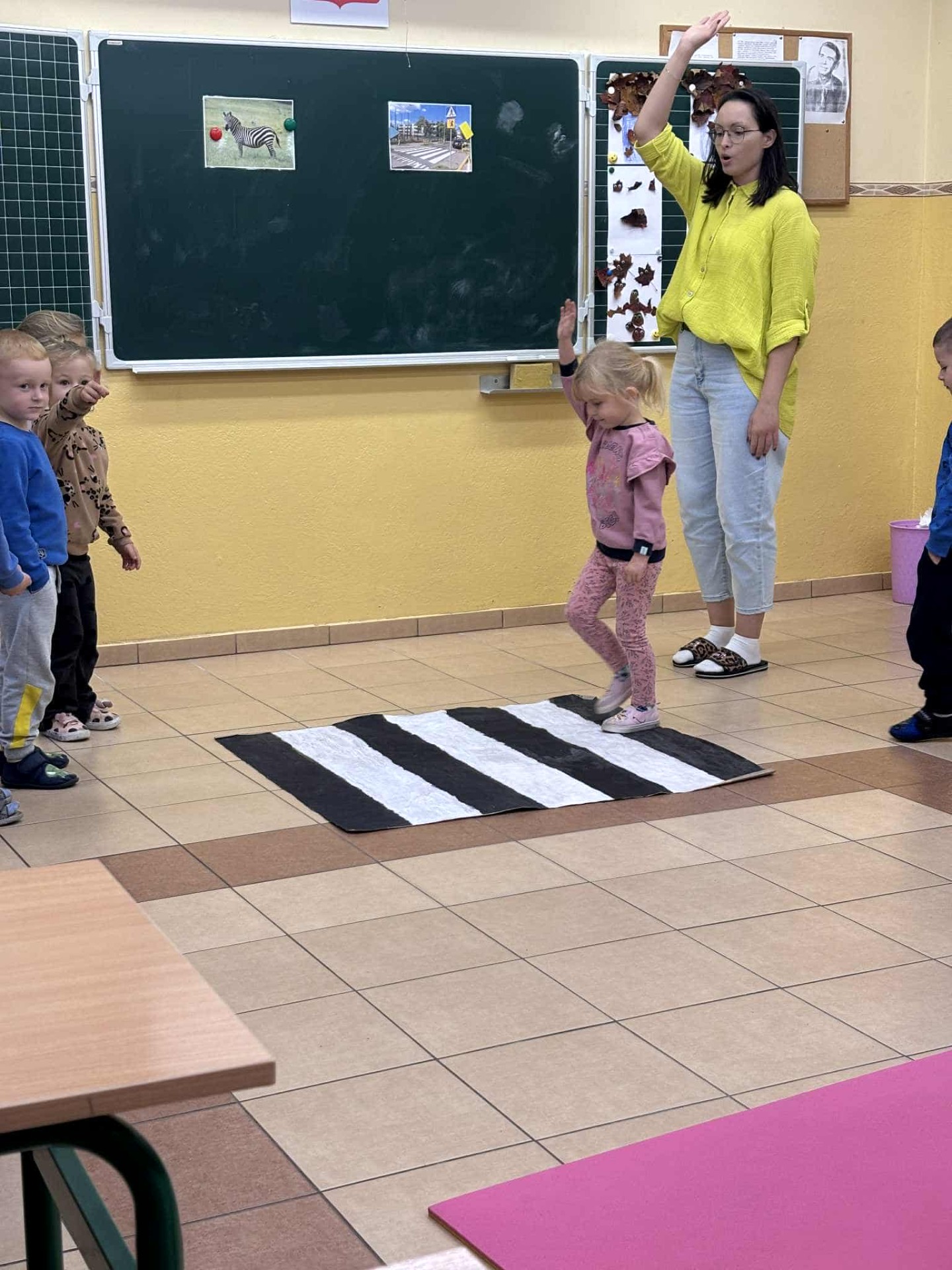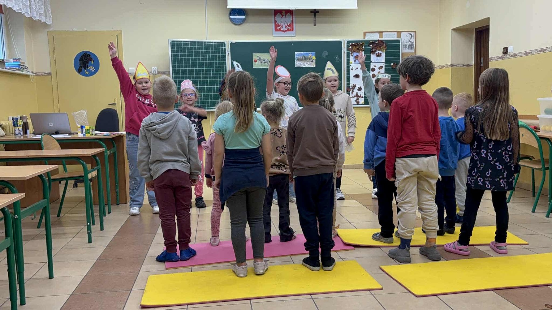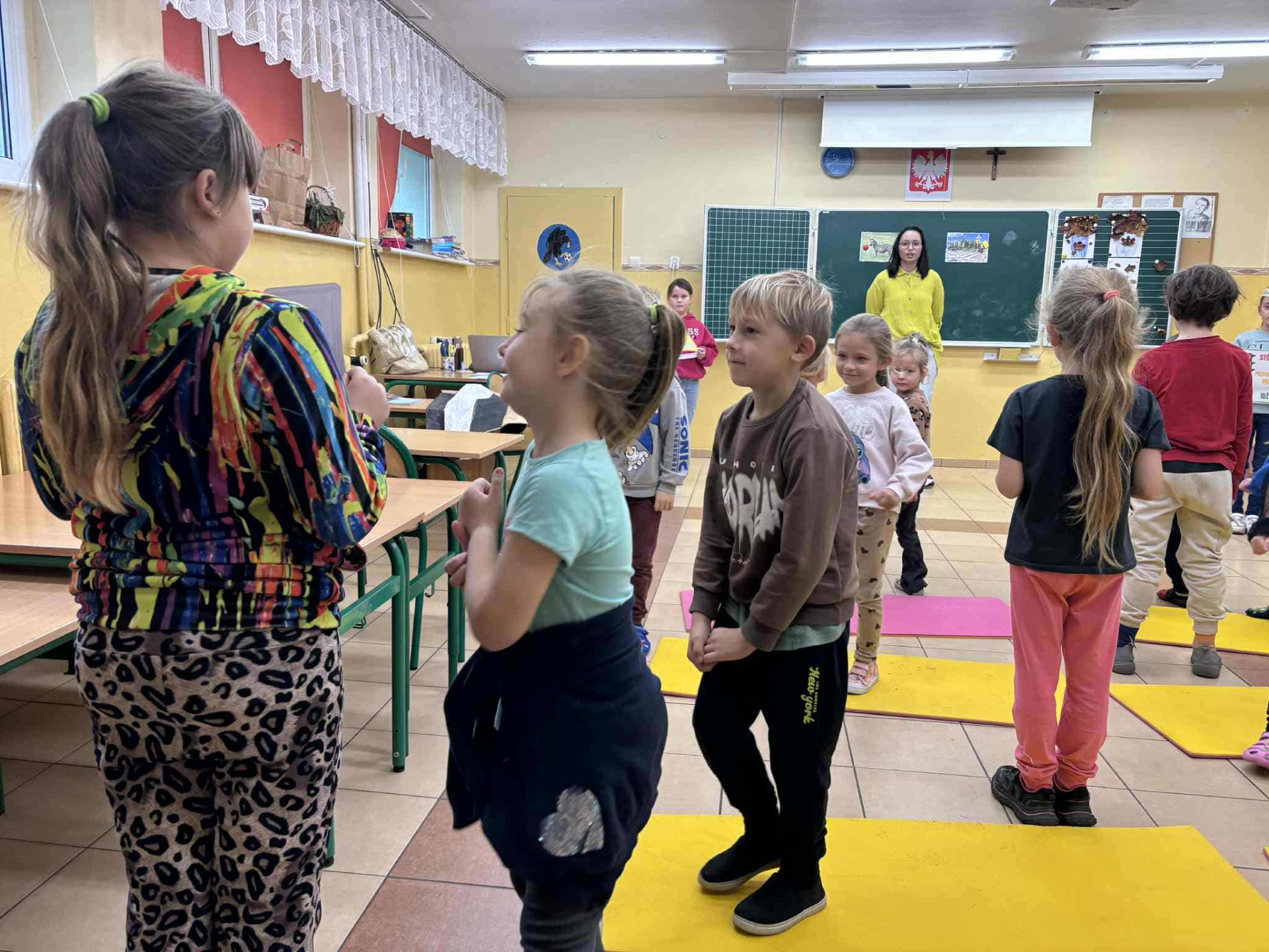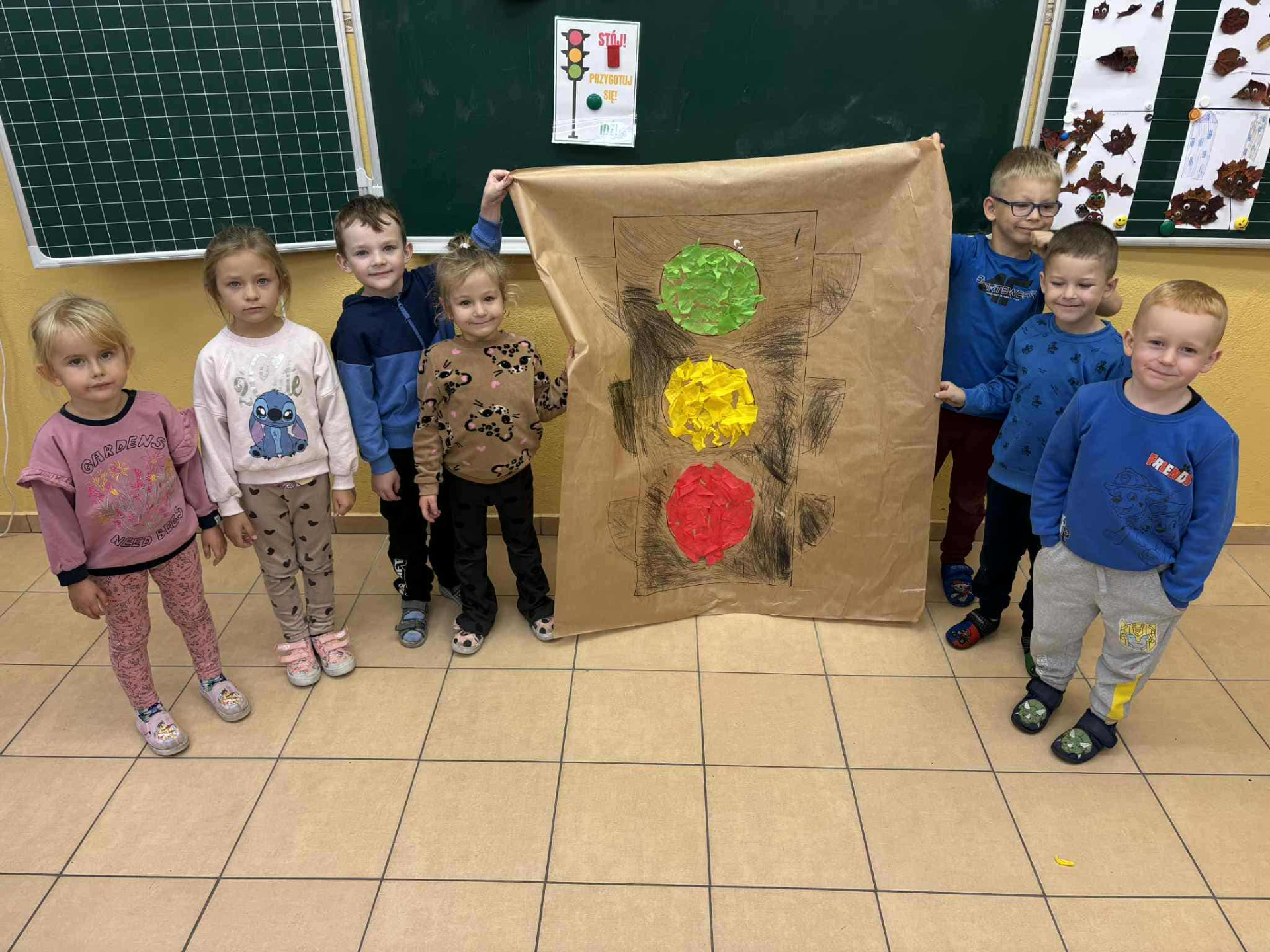Dnia 24.10.25r. klasa III zaprosiła oddział przedszkolny i klasę I na lekcję o bezpieczeństwie na drodze. Dziewczynki z klasy trzeciej przygotowały krótką inscenizację związaną z ruchem drogowym oraz piosenkę "Bezpieczna droga". Własnoręcznie wykonały opaski do inscenizacji oraz stworzyły pasy, które pomogły wszystkim poćwiczyć prawidłowe przechodzenie przez jezdnię. Lekcja przebiegła nam w radosnej i tanecznej atmosferze.