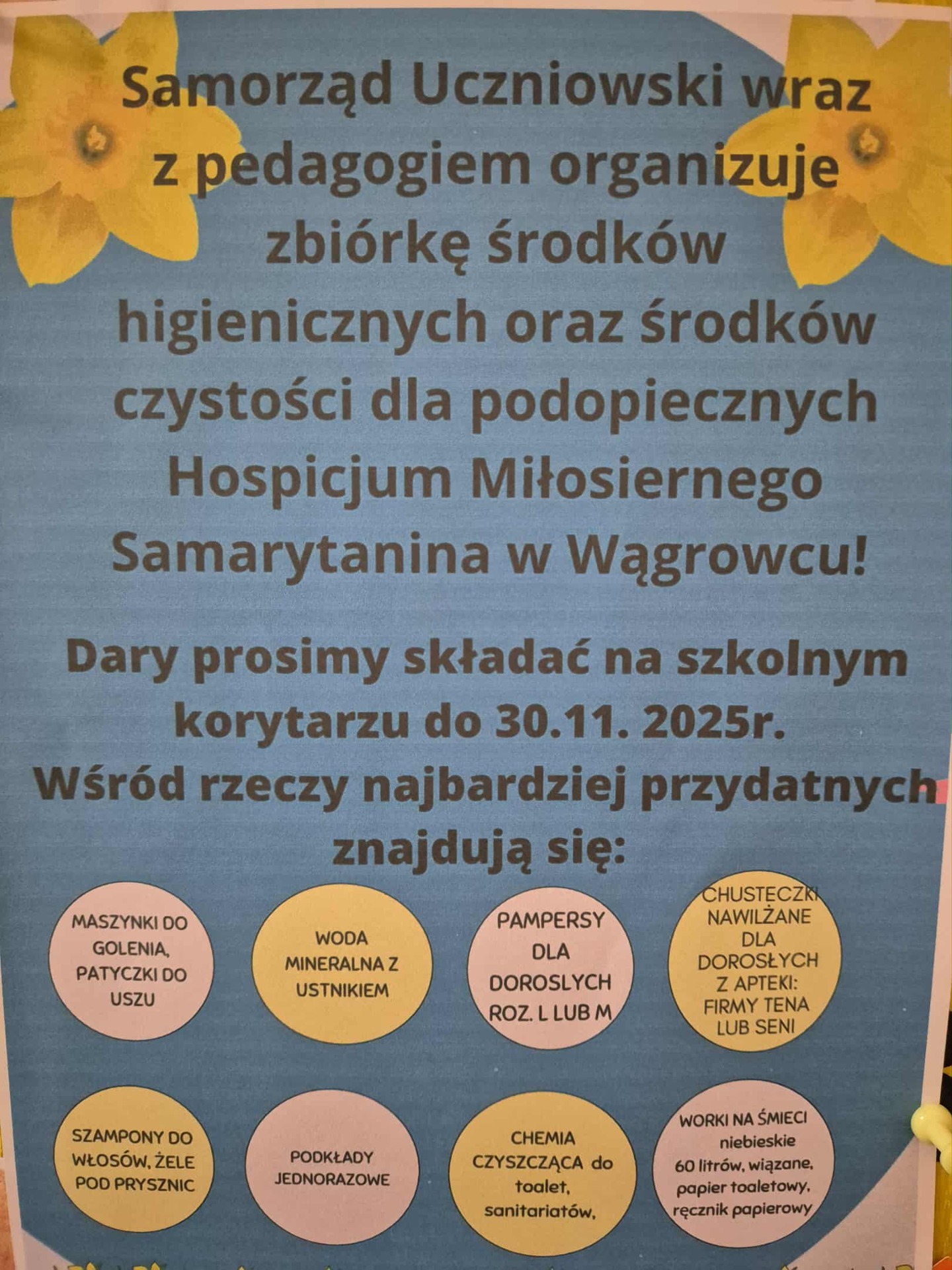Drodzy Rodzice, Uczniowie i Sympatycy szkoły. Przypominamy o trwającej w Naszej szkole zbiórce na rzecz podopiecznych Hospicjum w Wągrowcu. Serdecznie dziękujemy za przyłączenie się do akcji i złożone dary!